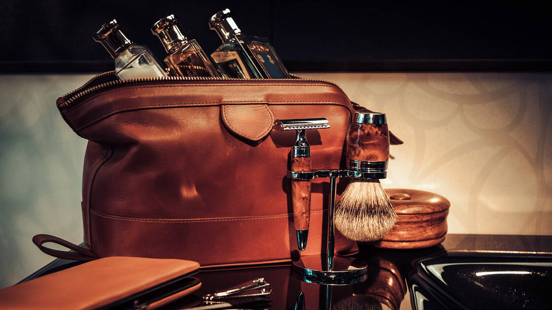 Stijlvolle cosmetica-artikelen als accessoires op de wastafel: luxe scheerset en toilettas van fijn leer.